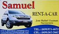Samuel Rent-a-Car Niewielka firma wynajmująca samochody w Sosua. Firma znajduje się około 300 metrów od recepcji Hotelu Casa Marina Reef. Ceny za dobę kształtują się między 45-55USD. Na miejscu pytajcie o Jose (Hose). Tel: (809)-571-4672 Tel Kom: (809)-267-7667 |